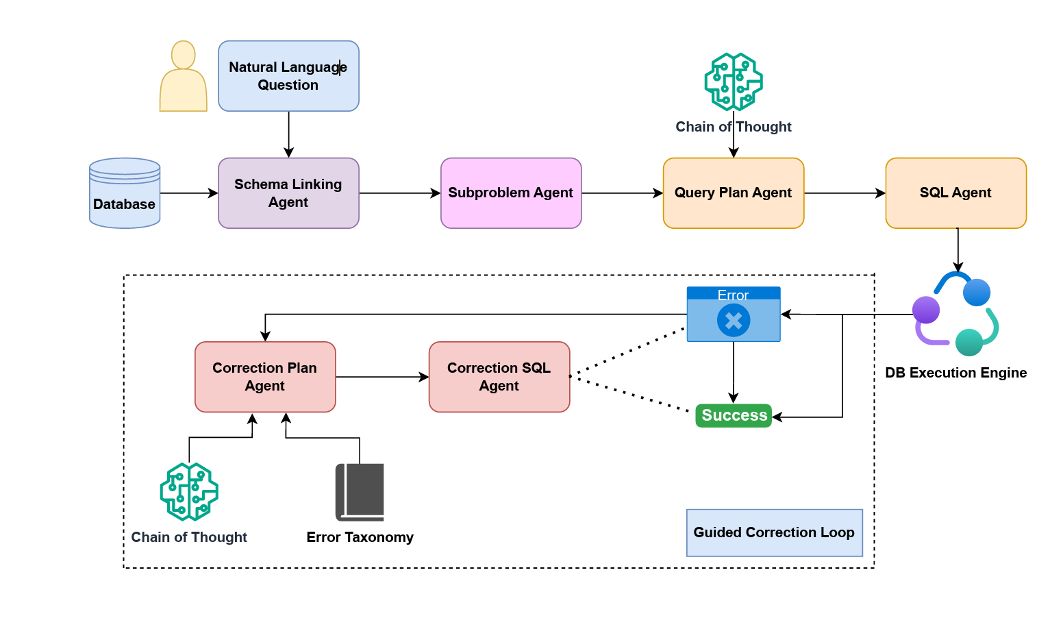 While the architecture provides the structural blueprint, the Agentic Workflow describes the dynamic, iterative lifecycle of a query. Drawing from recent advancements in autonomous database agents, such as the MAC-SQL (Multi-Agent Collaboration) framework, the workflow replaces linear translation with a "Reasoning-Acting-Correcting" cycle.