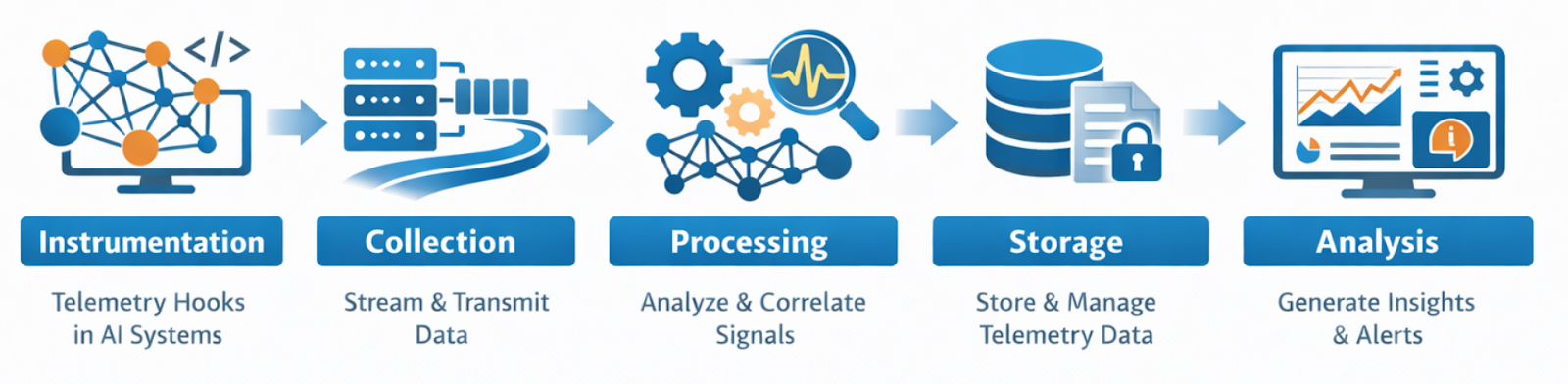 AI telemetry operates through a multi-stage pipeline that spans instrumentation, collection, processing, storage, and analysis. Each stage is designed to capture, transform, and interpret signals generated by AI systems in real time or near real time. The architecture of AI telemetry pipelines reflects the distributed and heterogeneous nature of modern AI infrastructure.