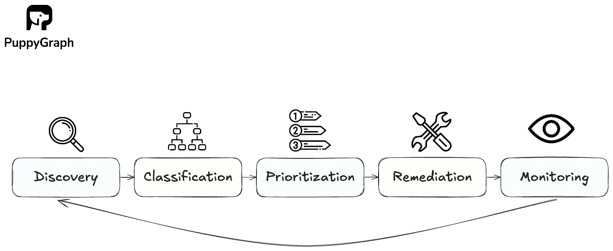 ASM runs on a straightforward loop: discover assets, assess and prioritize risk, remediate, then monitor. Let’s review it step by step.