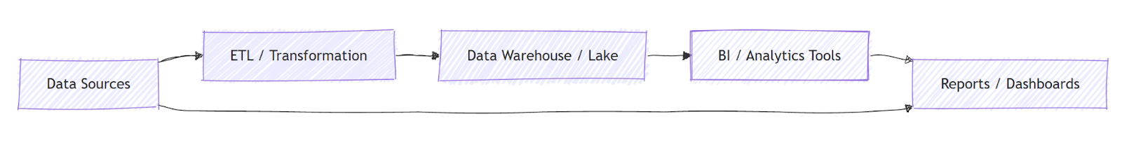 - Storage nodes: Warehouses, data lakes, or marts where transformed datasets are persisted