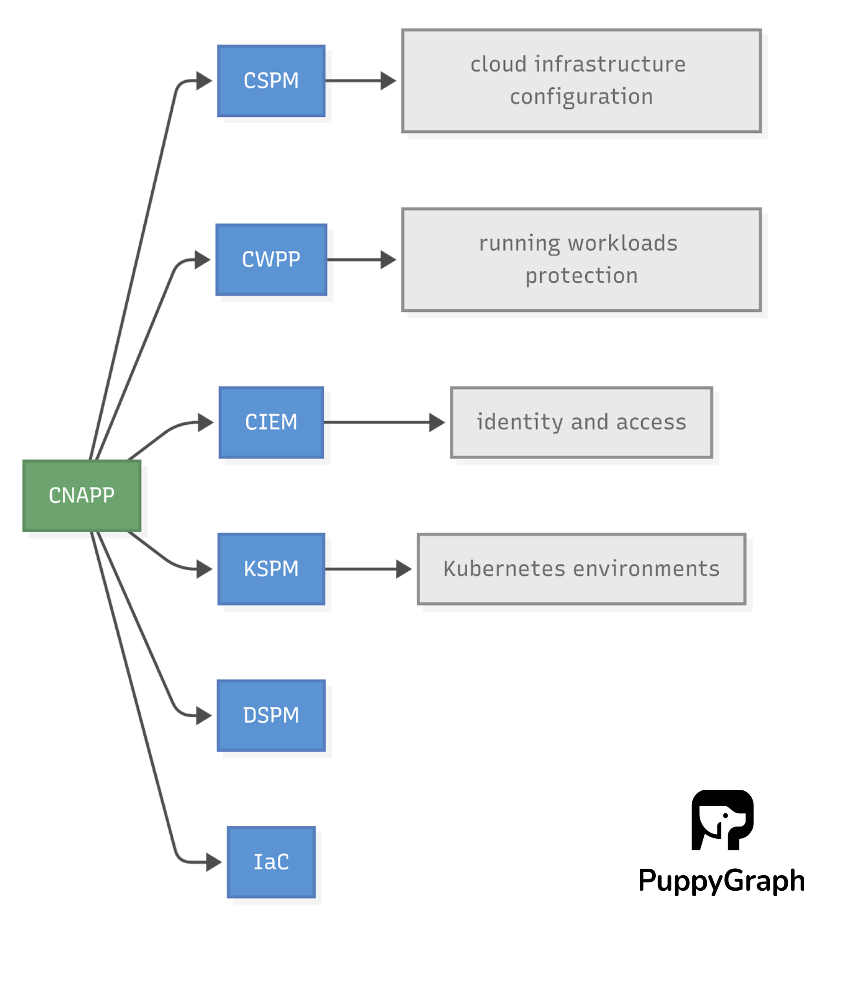 - Cloud-Native Application Protection Platform (CNAPP): CNAPP consolidates CSPM, CWPP, CIEM, KSPM, and other technologies such as Data Security Posture Management (DSPM) and Infrastructure-as-Code (IaC) scanning into a single platform. This unified approach provides holistic "code-to-cloud" security, reducing tool fragmentation and operational complexity.