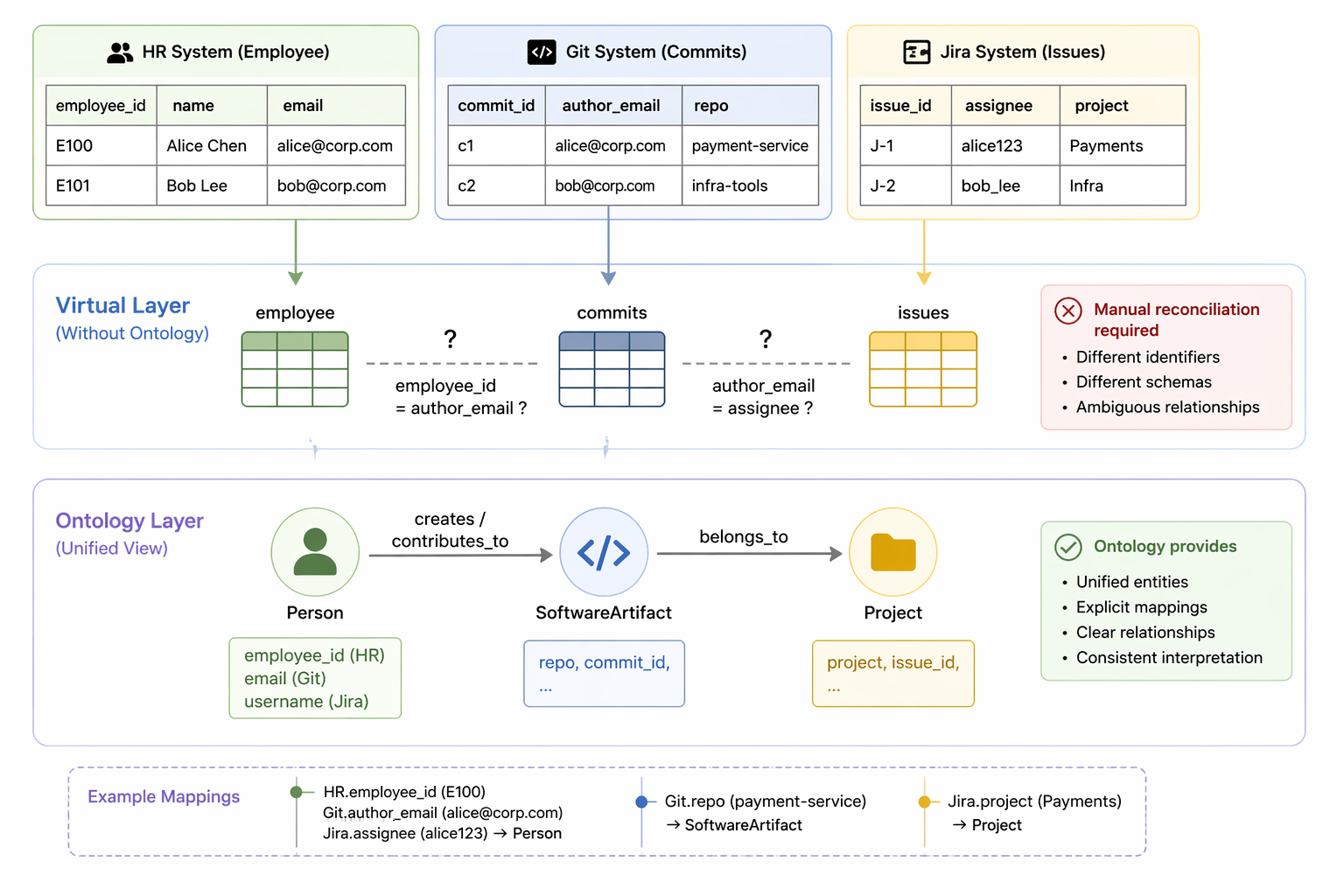 Consider a real-world example. Developer information may reside in an HR system, code contributions in a version control platform, and project metadata in an issue tracking system. Each system uses its own schema and identifiers. At the virtual layer, these appear as separate tables (e.g., employee, commits, and issues), and queries must manually reconcile them, such as mapping different identifiers (e.g., employee_id, author_email, or assignee) and resolving which records correspond to the same person across systems.