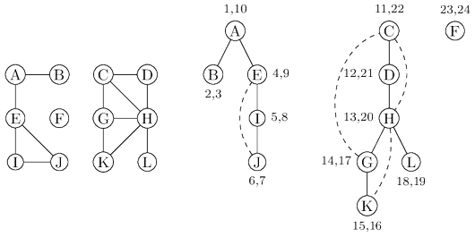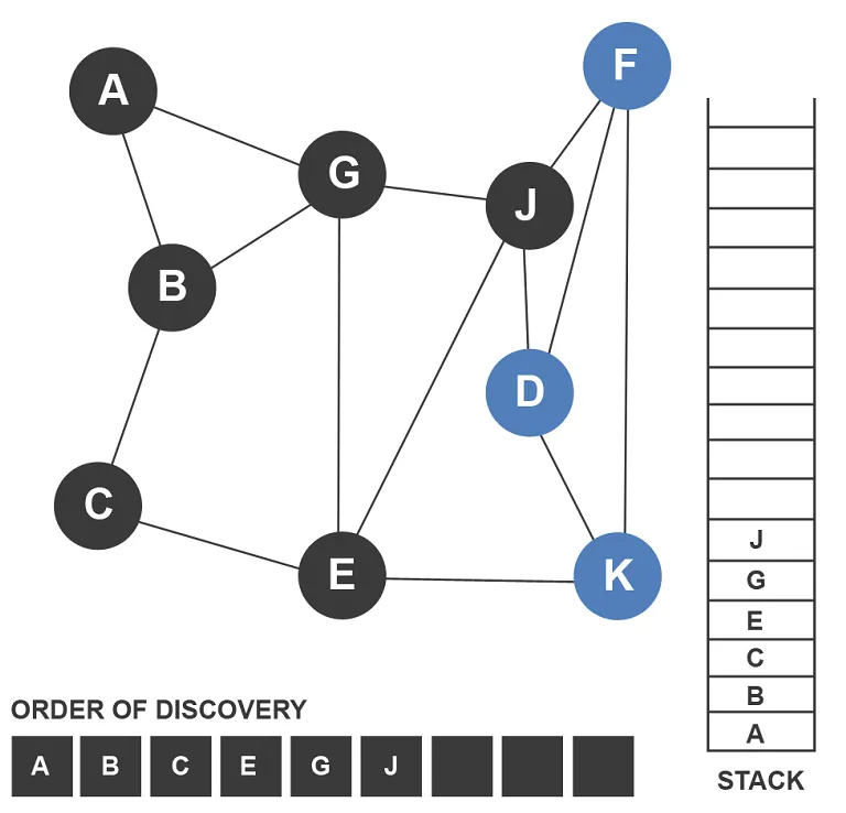 # If already visited, node is already popped (backtrack)This implementation produces the same traversal behavior as recursive DFS. The stack ensures that the most recently discovered node is explored first, preserving the depth-first exploration pattern.