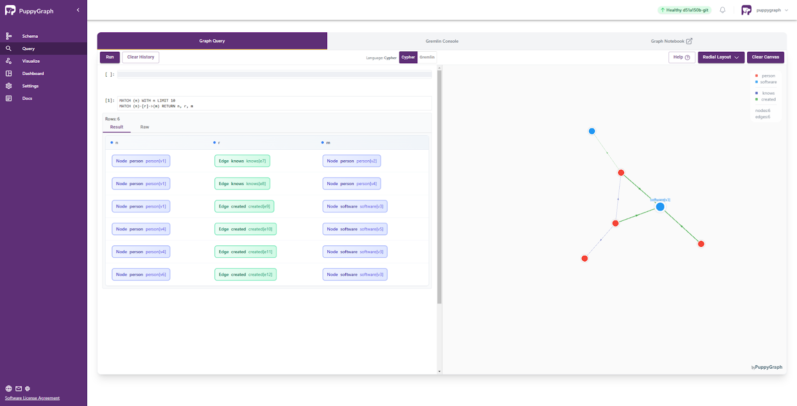 The final stage is interpretation and visualization. Graph visualization tools help analysts explore the results and communicate insights to stakeholders. This stage often involves dashboards or interactive visual interfaces that reveal how entities are connected within the network. For example, PuppyGraph provides a Query panel where users can run queries and view results visually, making it easier to identify patterns and key paths.