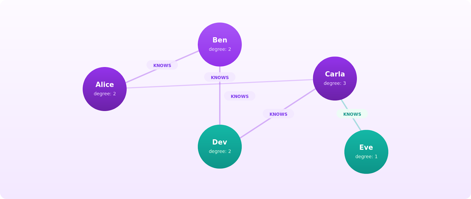 Now ask a question: who are Alice's friends-of-friends? You start at Alice, follow her edges to Ben and Carla, and then follow their edges outward. Ben points you to Dev. Carla points you to Dev and Eve. The answer is Dev and Eve, reached in exactly two hops. That's a traversal, and it's the kind of query graphs are built for.
