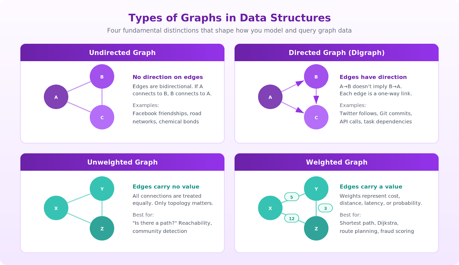 Weighted graphs unlock shortest path questions. The weight might represent distance, latency, cost, probability, or any numeric signal. Change the weight definition, and the "shortest path" becomes a different thing: the cheapest flight across a transportation network, the lowest-latency service route, the most likely fraud chain.