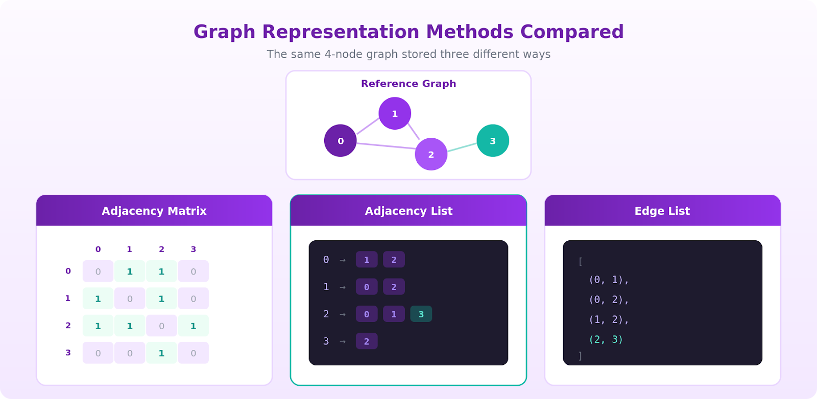 Once you pick a graph type, you have to decide how to store it. The representation you choose determines how much memory the graph uses and how fast each operation runs. There are three representations you'll see constantly.