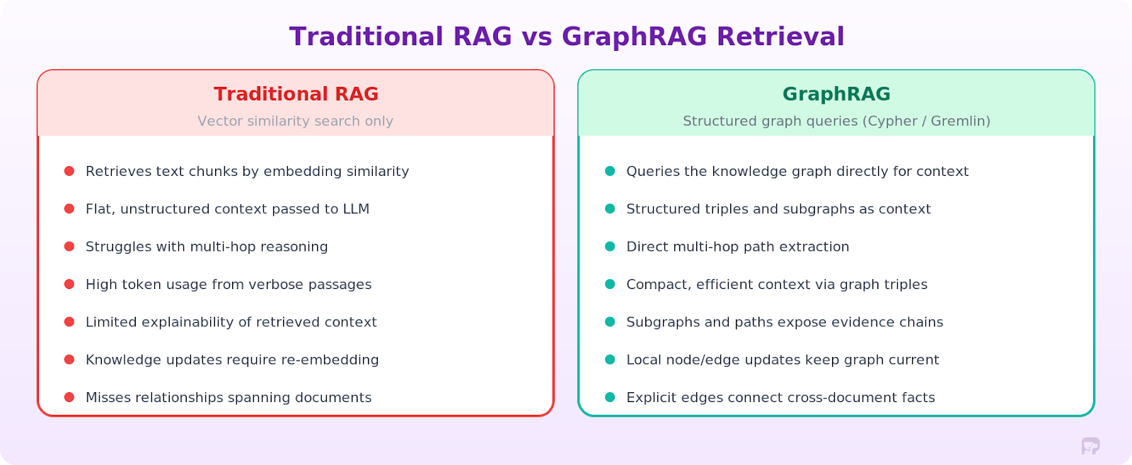 The split between traditional RAG and GraphRAG comes down to how you retrieve context. Traditional RAG flattens everything to text chunks and retrieves by similarity. GraphRAG keeps graph structures intact, and the relationships between entities come along for the ride.