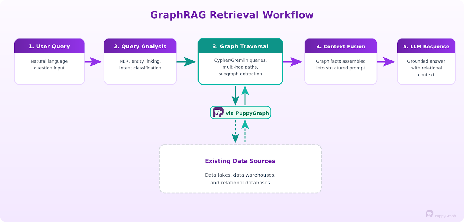 Without ETL overhead, you can use the agentic traversal approach described earlier. AI agents treat PuppyGraph's graph layer as a tool in a broader reasoning workflow, deciding at each step how to traverse the graph based on the question's needs. To see a step-by-step walkthrough, you can check out the GraphRAG guide we shared earlier in this blog!