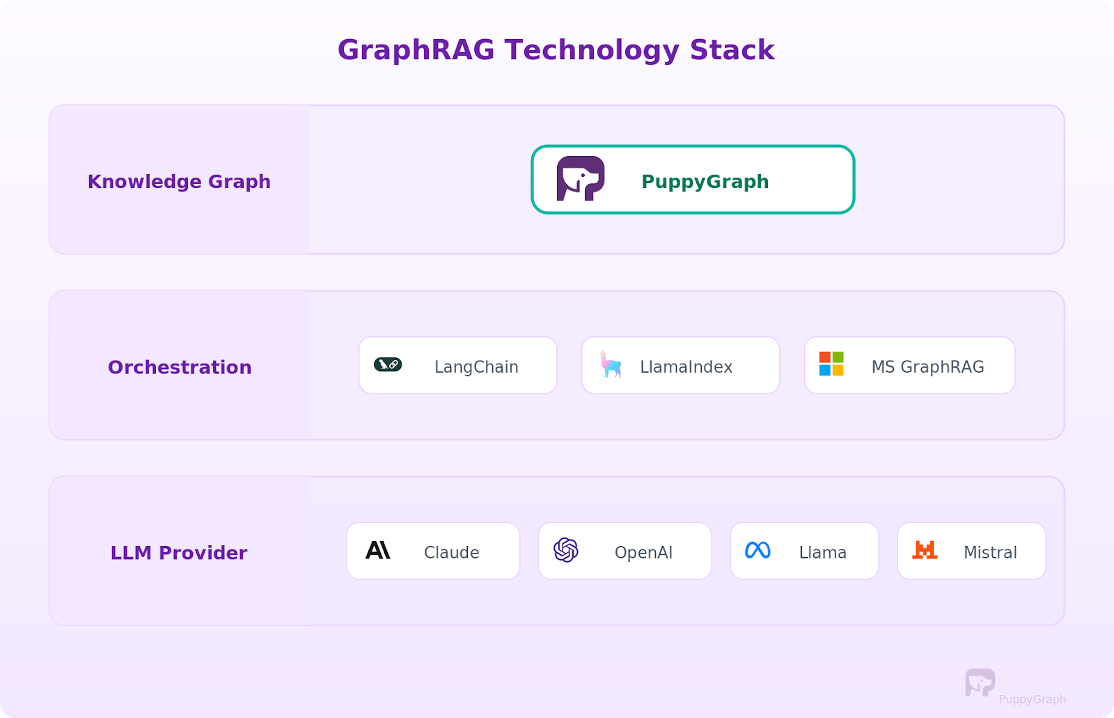 LLM Providers. Any capable LLM works as the generation layer. Claude, OpenAI, Llama, and Mistral models are all commonly used. The choice depends on your accuracy requirements, latency constraints, and whether you need the model to handle structured graph data well in its context window.