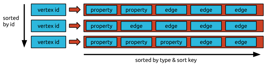JanusGraph stores the graph in an adjacency list format, leveraging the Bigtable data model. Each node’s adjacency list is stored as a row, with the node ID as the row key. This allows for the compact storage of the node’s incident edges and properties which help to speed up traversals.
