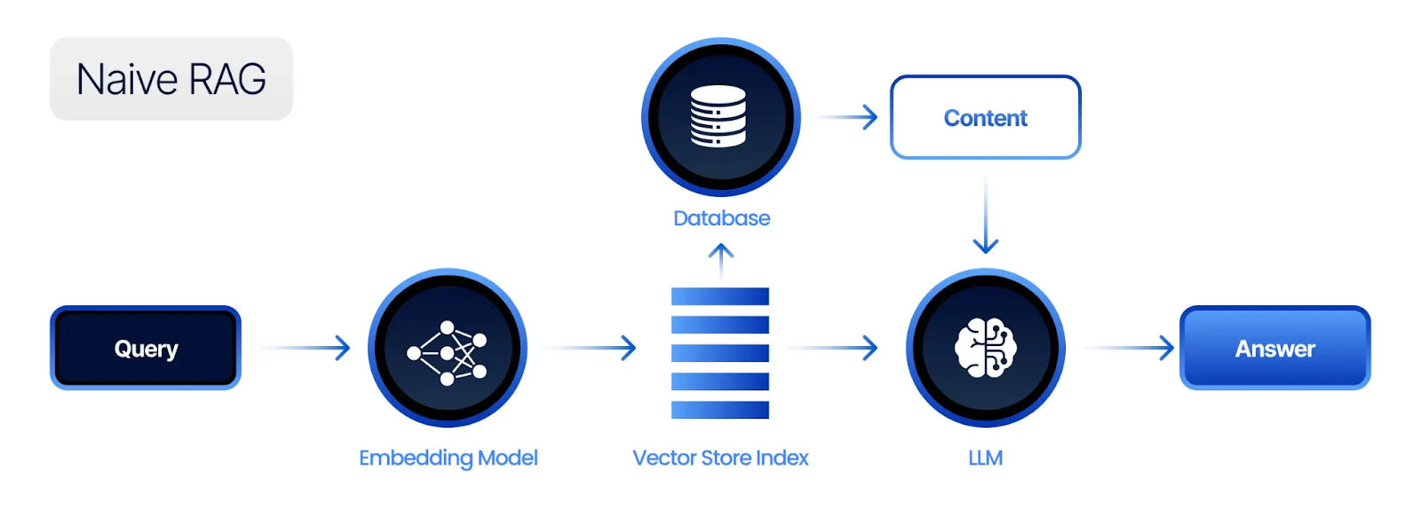 Naïve RAG represents the simplest implementation of retrieval-augmented generation. A user query is converted into an embedding, matched against a vector database, and the most relevant documents are retrieved. These documents are then inserted into the prompt, and the language model generates an answer based on the combined context. This architecture is easy to implement and works well for straightforward question-answering tasks or document retrieval scenarios where context is relatively small and well-structured.