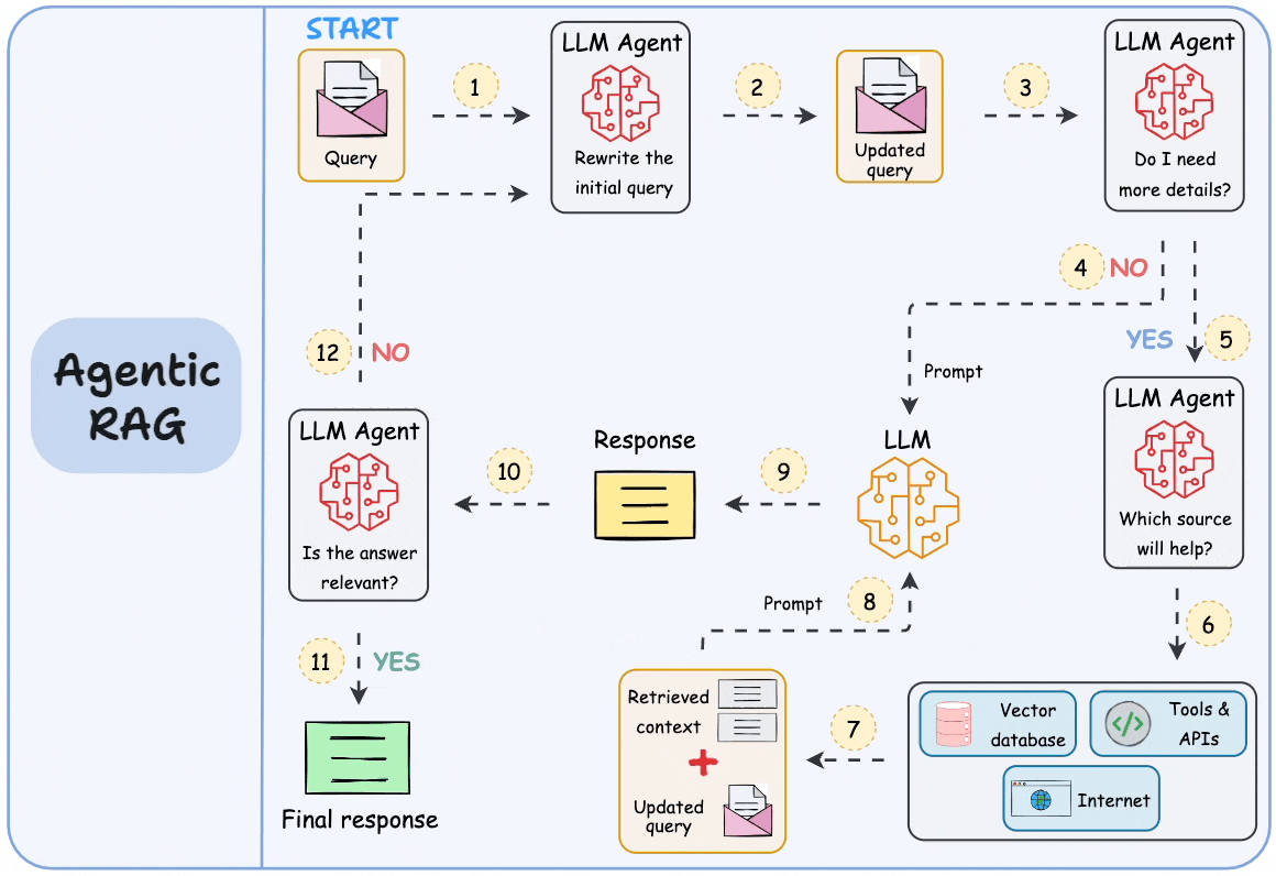 Agentic RAG introduces autonomous decision-making into the retrieval process. Instead of performing a single retrieval step, an AI agent decides when to search, which tools to use, and how to refine queries iteratively. The agent may call external APIs, run database queries, or request additional context based on intermediate reasoning. This approach allows the system to adapt dynamically to complex tasks that cannot be solved with a single retrieval pass.