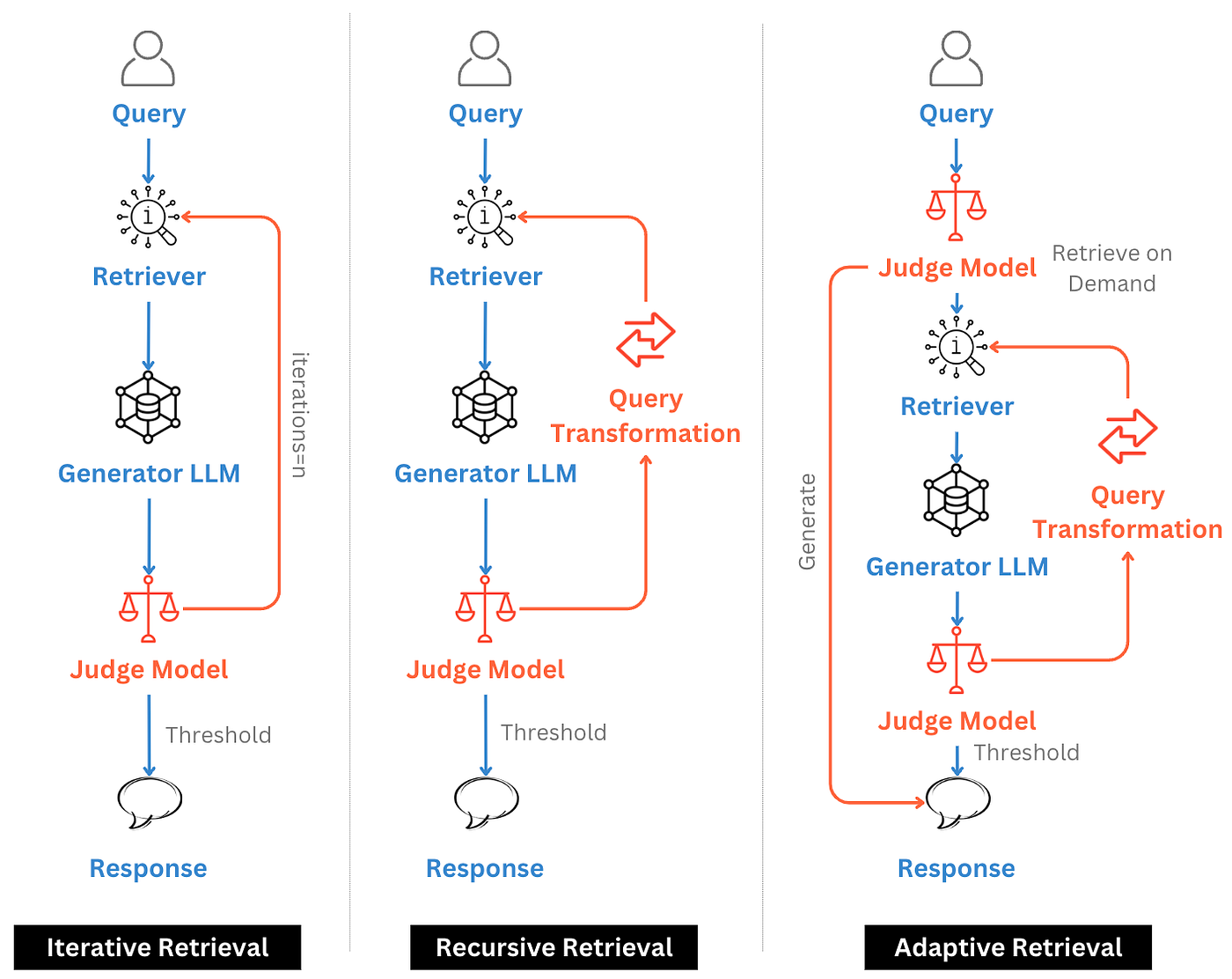 Iterative pipelines also support real-time adjustments during a single conversation. For example, if the model detects ambiguity or incomplete information, it can request clarification or initiate additional retrieval steps automatically. This adaptability improves user experience and increases reliability in complex environments. This idea shares some similarities with agentic RAG paradigms, as both rely on LLM-based decision-making. The key difference is that in agentic workflows, the model can autonomously decide whether to perform retrieval, which tools to use, and how to refine queries based on intermediate reasoning. In contrast, adaptive or iterative RAG pipelines typically rely on a judge or evaluation component to determine whether retrieval is needed and which retrieval strategy should be applied. Adaptive RAG architectures represent a shift from static pipelines toward dynamic systems that evolve alongside data sources, user behavior, and organizational knowledge requirements.
