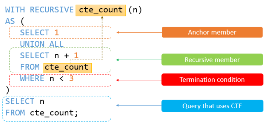 A recursive CTE follows a strict three-part structure within a WITH RECURSIVE block:
