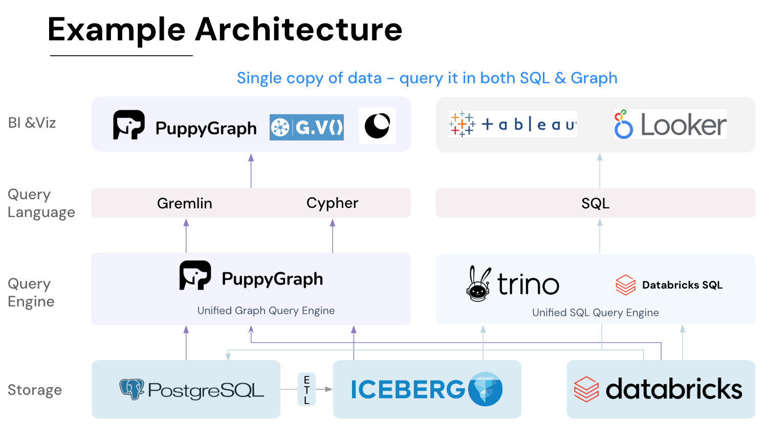 - Best of SQL and Graph: Because PuppyGraph queries your data in place, teams can use their existing SQL engines for tabular workloads and PuppyGraph for relationship-heavy analysis, all on the same source tables. No need to force every use case through a graph database or retrain teams on a new query language.