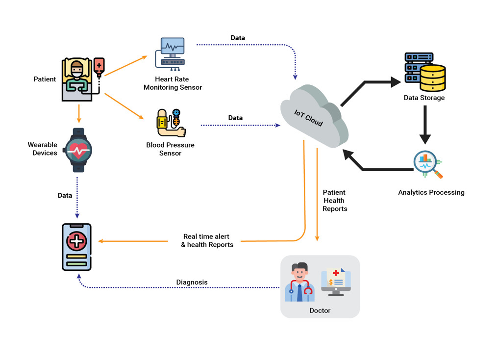 In IoT-driven healthcare systems, wearable devices and biomedical sensors collect vital signs such as heart rate, blood pressure, oxygen saturation, and activity levels. This telemetry data is transmitted through IoT gateways and cloud platforms, where real-time analysis enables anomaly detection, automated alerts, and trend analysis. Clinicians can monitor patients remotely, identify early warning signs of health deterioration, and make data-driven decisions without requiring frequent in-person visits. This approach supports proactive and preventive care models, improves patient outcomes, and reduces the burden on healthcare facilities. Telemetry-based remote patient monitoring is especially valuable for managing chronic diseases and supporting telehealth services.