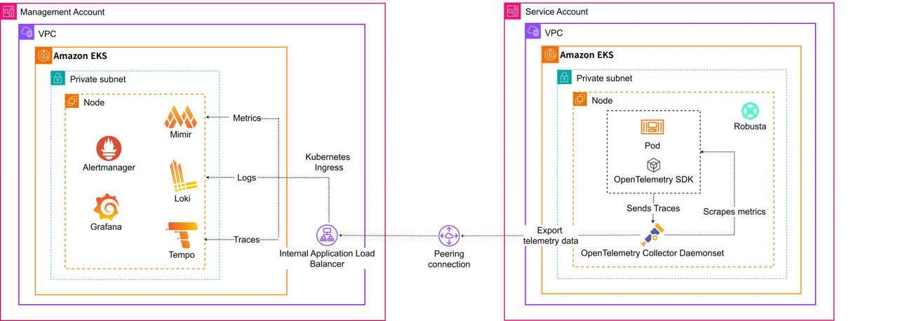 As shown in the figure, application services and infrastructure components are instrumented to emit telemetry signals at runtime. These signals are collected by telemetry agents or OpenTelemetry-compatible collectors, which perform aggregation, filtering, and transformation before exporting the data to centralized backend systems. Metrics are typically stored in time-series databases, logs in centralized logging systems, and traces in distributed tracing backends. Visualization and alerting tools consume this unified telemetry data to provide dashboards, real-time monitoring, and automated alerts, enabling operators to correlate events across multiple services and infrastructure layers.